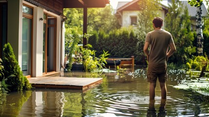 worried homeowner looking at a flooded backyard after a storm concept of weather-related home problems