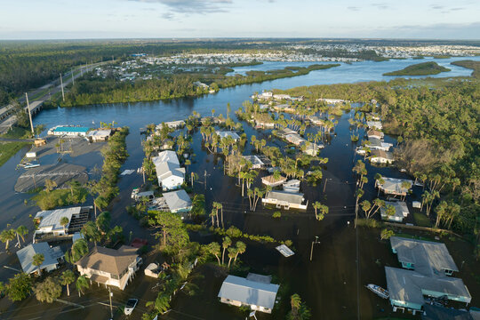 Homes flooded during a hurricane, Florida, fictitious depiction, artist's impression