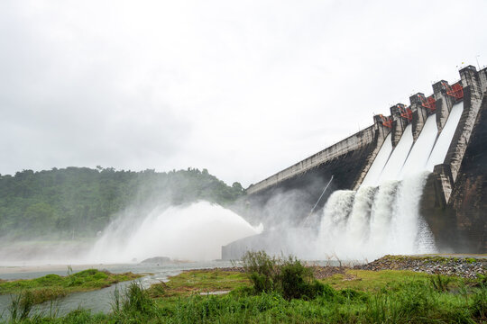 Spillway of Khun Dan Prakarn Chon Dam at Nakhon Nayok province, Thailand in rainy season.