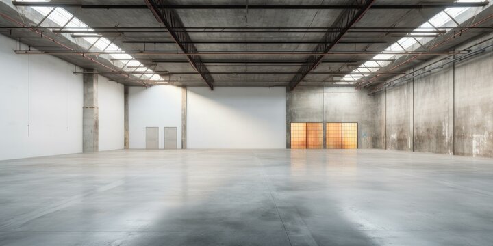 An empty warehouse with concrete floors and a large window. Generative AI.