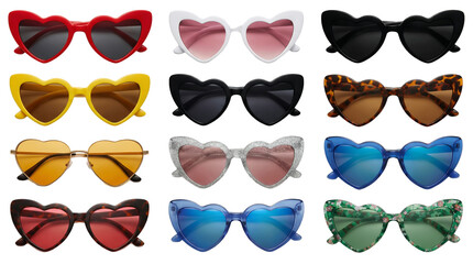 Heart shaped sunglasses set including red, white, black, yellow, tortoiseshell, glitter, blue, and floral patterns isolated. Stylish eyewear and fashion accessory collection.