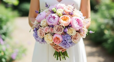 Generative AI illustration of young albino bride with elegant makeup and flower heads touching face gently against floral decorations