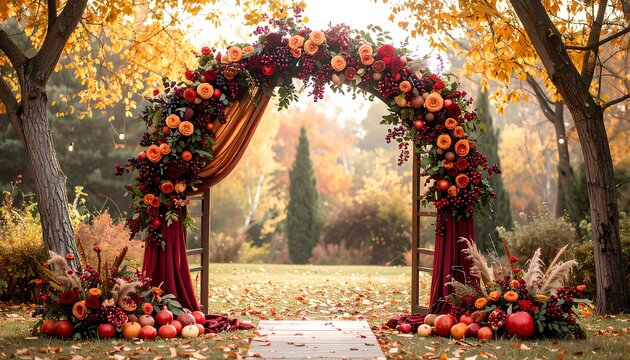 Description: Romantic watercolor illustration of wedding arches, chandeliers, candles, and floral arrangements in elegant rustic style, ideal for wedding decor and event design.