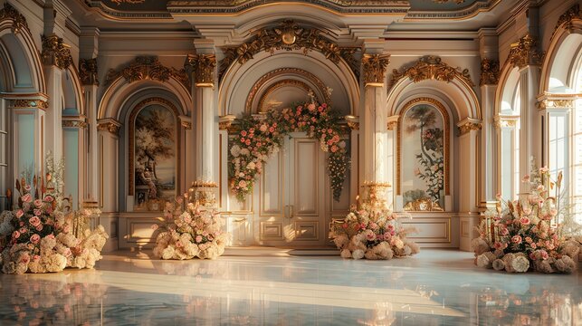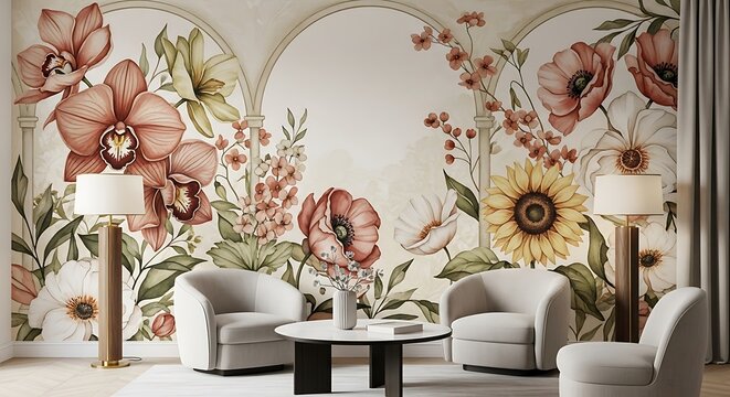 Ai generated image of charming floral wallpaper with arches and diverse blooms decorates a cozy living room
