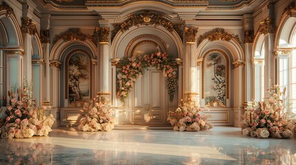 Enchanted garden pathway adorned with rose arches and soft morning light in a serene outdoor setting