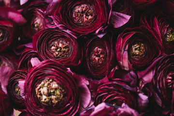 Beautiful tender blossoming dark purple Ranunculus flowers texture, close up view