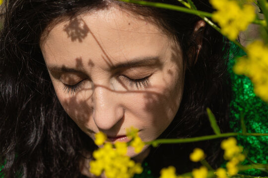 Beauty portrait of daydreaming woman with flower shadows on skin