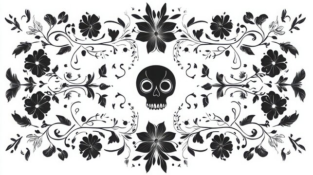 Ornate Black and White Skull with Floral Frame Illustration