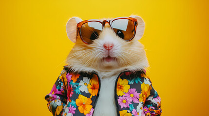 A humorous and fashionable hamster wearing sunglasses and a colorful floral jacket, bright yellow background. [Neon Folklore] | Bright Beasts | radiant animals. Illustration