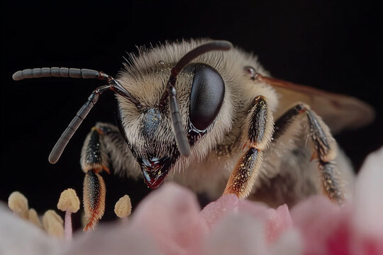 Honey bee rests on flower, collecting pollen in warm light. This honey bee forages on blossom, its body dusted with pollen. Scene honey bee gathering nectar symbolizes summer's bounty.