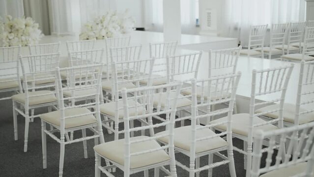 An event planner reviews a checklist at a decorated event venue surrounded by floral arrangements, ensuring every detail is perfect for the occasion.