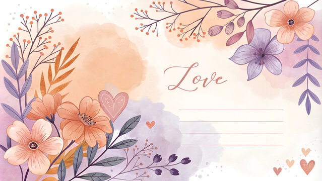 Romantic watercolor stationery with floral decoration and "Love" text for greeting cards copy space