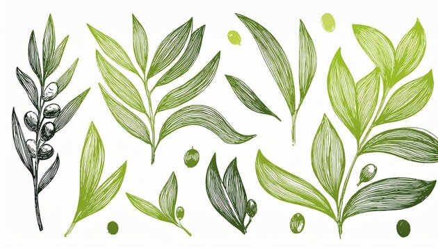 Leaf brush hand drawn ink elements. Green crayon texture brush  olive, flower, leaf  hand drawn illustration. Brush branch, botanical floral silhouette perfect any project