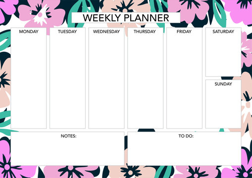 Weekly planner page for printing. A4 size. Planner page with florals.