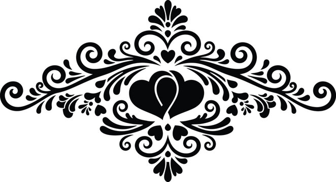 Elegant double heart silhouette with ornate vintage flourishes and symmetrical filigree scrolls for romantic wedding invitations and decorative art.