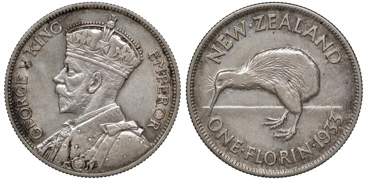 New Zealand silver coin 1 one florin 1933, bust of King George V left, kiwi bird,