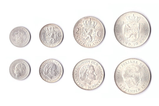 Old Dutch silver coins: half guilder coin, guilder (gulden), 2.5 guilders (rijksdaalder) and 10 guilder coin, depicting queen Wilhelmina and queen Juliana, front and back side, isolated on white