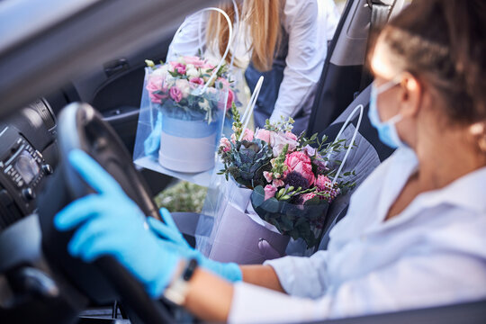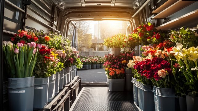 Flower Delivery Van Interior with Vibrant Floral Arrangements in Natural Sunlight