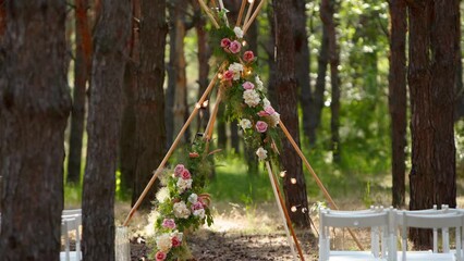 decor in the restaurant , floristic decoration of the festive table, a large vase with bright flowers, a festive dinner in honor of the wedding, table setting before dinner