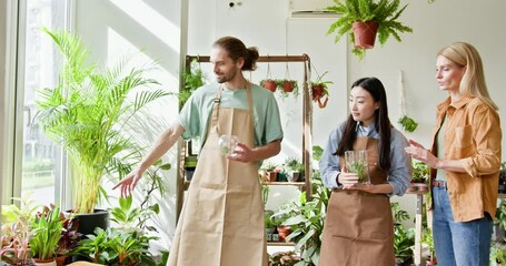 Diverse group of young people arranging flowers in florists workshop while attending class on floral art
