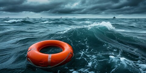 Lifebuoy floating in open sea with waves, lifeboats in the distance under an overcast sky.