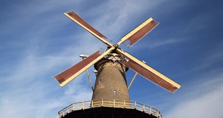 Delft, The Netherlands, August 26, 2025. Famous De Roos windmill in Delft. Wide, low angle view, sunny summer day, real time footage