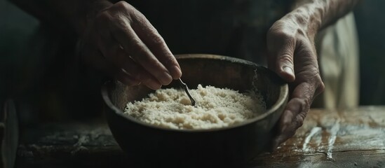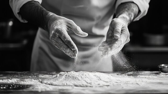 Baker kneads dough, floury hands, kitchen, rustic background, food blog