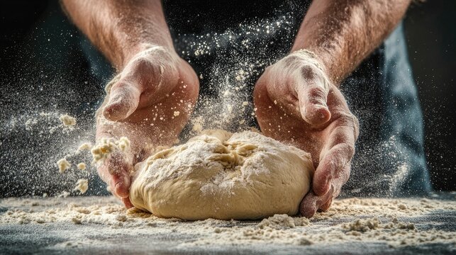 Weathered hands are dusted with flour, poised over a mound of dough, ready to create something delicious.