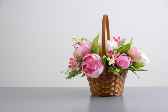 Beautiful bouquet of pink peonies. Floral composition in straw basket on light gray background