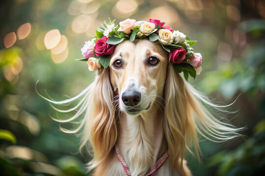 Elegant Saluki dog adorned with a delicate flower crown featuring roses and gardenias, posing regally against a soft, blurred background of lush greenery.