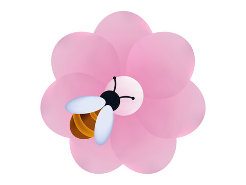 Bee and flower 3d, isolated icon. One insect collects nectar, pollen. Honey bee, wild wasp or bumblebee on a flowering plant with pink petals. The concept of active labor, pollination closeup. Vector