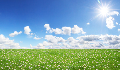 Daisy flowers bloom in green field at sunrise golden hour. Soft light, water drops on leaves create magical natural mood. Peaceful botanical scene background for summer.