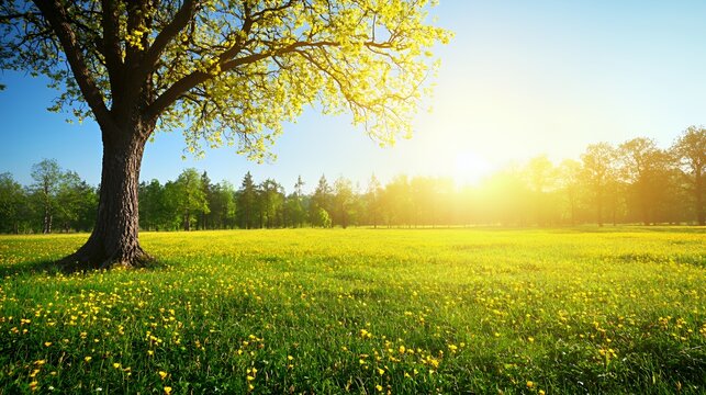 Lone tree standing in a vibrant green field under a colorful sunset sky.