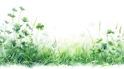 A lush green field with a few clovers in the foreground