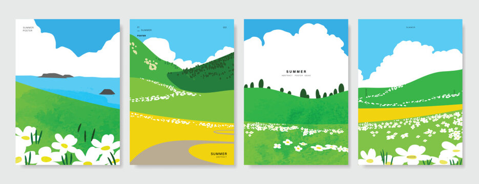 Abstract Green Summer landscape background vector set. Nature wallpaper of green field on mountain, yellow flowers, blue sky , rice, river. Watercolor illustration for cover, wall art, decoration.