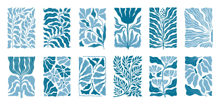 Matisse style flowers. Geometric plant pattern, abstract minimal modern collage, floral and nature trendy blue doodles. Vector illustration background
