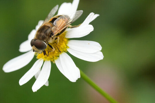 big fly hoverfly on a flower with proboscis drinking nectar
