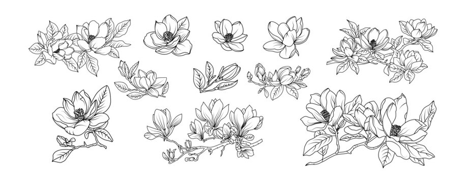 Magnolia flower arrangement line art on white background. Silhouette magnolia botanical hand drawn element for wedding, invitation frame design, vector illustration