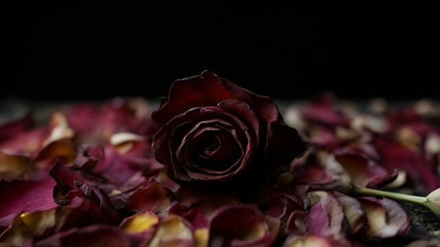 Dried red rose flower pattern which has withered or lacks water botanical background. An old dry rose with crumbs from dry petals. Dried Rosebuds. Panorama. Banner. Space for text and design