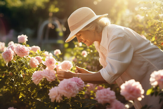 The portrait of a happy female elderly is picking up pink flowers at her garden in the morning. Generative AI.