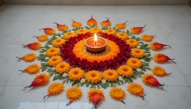 Delicate flower petals in vibrant hues form a circular Rangoli design radiating beauty on a pristine white background ideal for celebrations and spiritual events