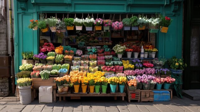 A lively flower market stall showcases a vibrant array of blooms, capturing the essence of nature’s beauty and inviting passersby into a world of color.