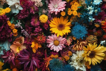 A close-up shot of a fresh flower stall in autumn, showcasing an array of colorful flowers in full bloom, perfect for fall season decorations.