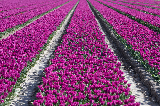 big field of purple tulip flowerd
