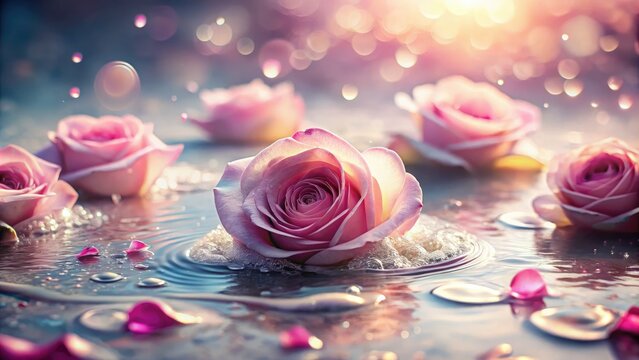 Dreamy bubble bath, surreal pink rose petals float on soapy water, abstract floral art.