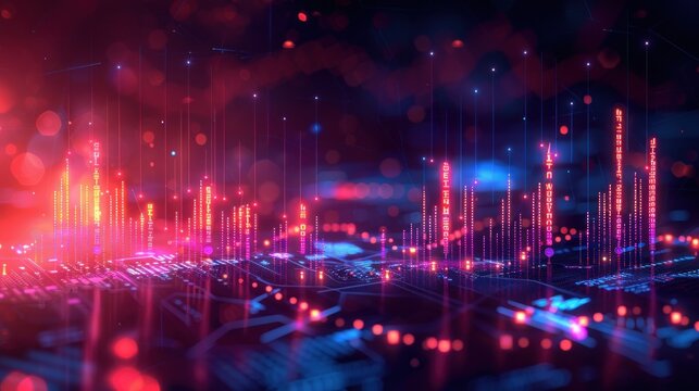 Digital display of financial chart shows fluctuating stock market data with red and blue sticks - market volatility and economic analysis concept.