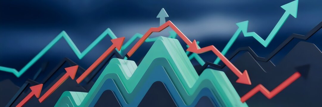 3D render of fluctuating financial chart with arrows pointing up and down in mountain shape – Ideal for financial analysis, investment strategies, or market trend visuals.