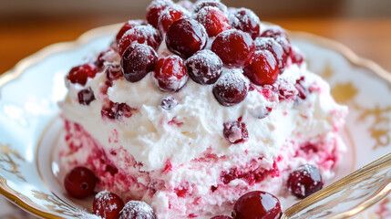 Delightful layers of cranberry fluff dessert garnished with fresh berries, showcasing vibrant colors and a tempting texture, perfect for any seasonal gathering