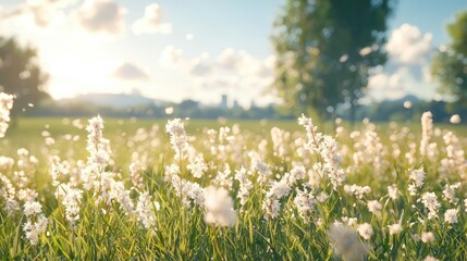 A beautiful view of a field of dandelions at sunset, with the sun's rays shining through. The soft, fluffy seed heads of the dandelions create a dreamy and ethereal landscape
