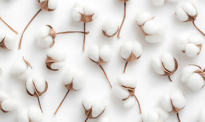 Cotton boll pattern on a white background, top view. Soft cotton texture with fluffy seed heads of the plant. White natural fabric material for textile and design, fabric print, or wallpaper